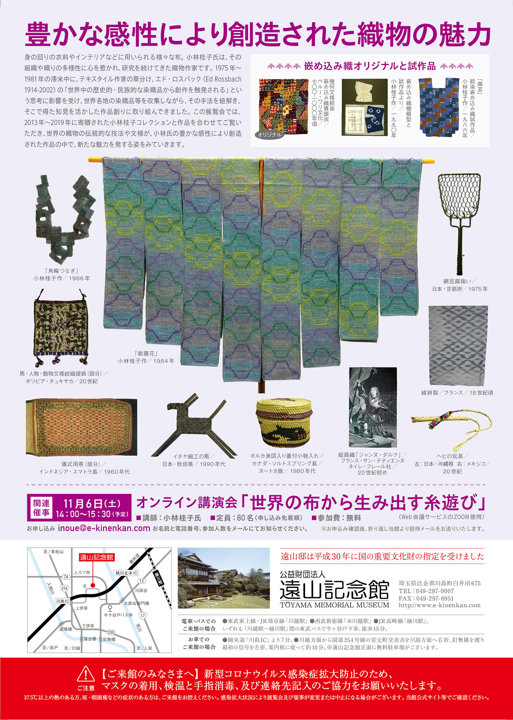 小林桂子先生より「織の世界で遊ぶ心」展では、50年ほど、糸と遊びながら布を作ってきました小林桂子の作品と、その制作にインスピレーションを得た世界中の歴史的・民族的な染織品をまぜた展示です。 バスケットや布は、技法や構造が、編・もじり・交差に分類されることから、展示品に三種類の色分けをしてあります。 北米のナバホインディアンや、南米ぺルーの織合わせ織からヒントを得た、四方耳の織物作品群、曲がり織・絣織・多綜絖の機で織る絹のポンチョなど、作品と世界中の布とと一緒に並べています。 11月6日のオンライン講演会では、用途のない布の創始者であるエド・ロスバック氏の時代背景、同時代の現代絵画群、そして70年代・80年代・90年代を通して20世紀のテキスタイルを見ていきます。 |